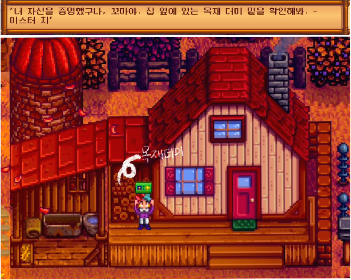 "너 자신을 증명했구나, 꼬마야. 집 옆에 있는 목재 더미 밑을 확인해봐 -미스터 치"