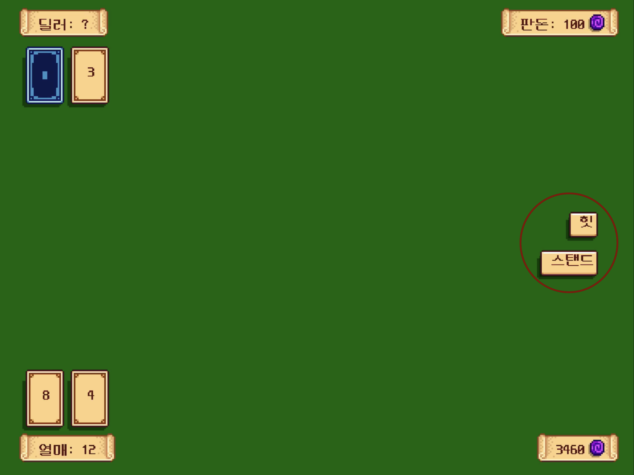 오른쪽에 '힛' 과 '스탠드' 버튼이 있는데 '힛'으로 카드의 합이 21에 가까운 숫자가 나올 때 까지 내 카드를 뒤집는다.