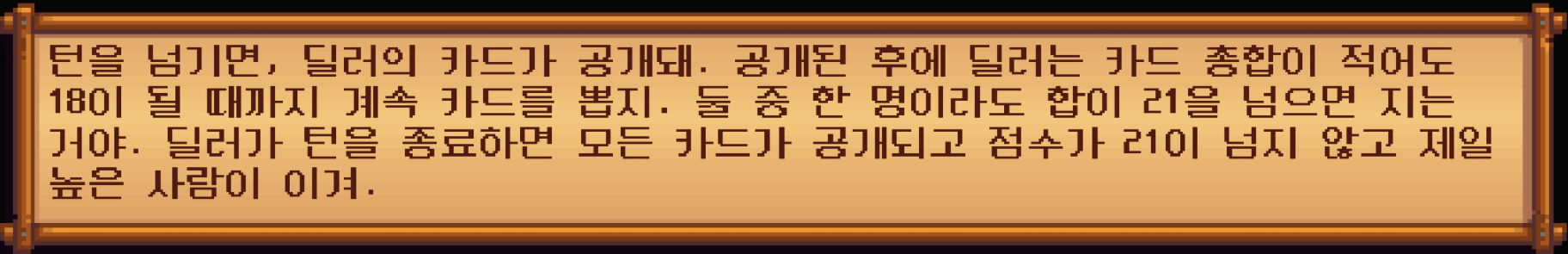 딜러와 나의 카드 중 21보다 적지만 가까운 숫자이거나 합이 정확히 21이 나오면 이긴다.