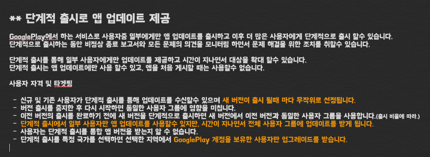 즉, 개발자가 단계적 출시의 Google Play 서비스를 사용하고 있다면, 극히 일부 사용자에게만 업데이트 제공이 되며 이후에 모든 사용자에게 공식적으로 업데이트 진행이 된다는 이야기이다...심지어 Google Play 계정으로 구매한 사람의 한에서다.